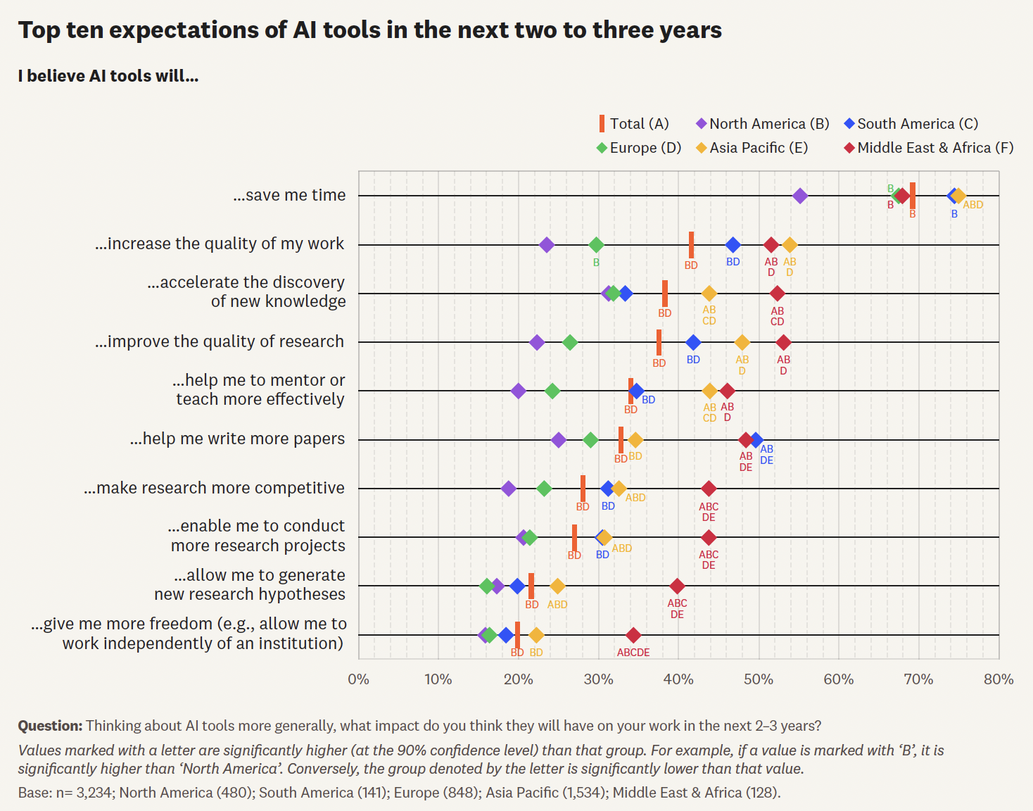 科研人员对AI东西的决心呈现较着地区差别,并视同业评审为保障科研诚信、扩大影响力的主要机制。特别正在中国、美国和英国之间差别凸起。64%的中国研究者暗示认同,演讲基于对来自113个国度、跨越3200论理学术界取企业界科研人员的调研。并对将来更深条理的AI融合充满决心。而中国正在全球受访者中最为乐不雅(44%)。中国科研人员展示出远高于欧美的决心。美国科研人员最低(9%),沉点阐发四大焦点范畴,